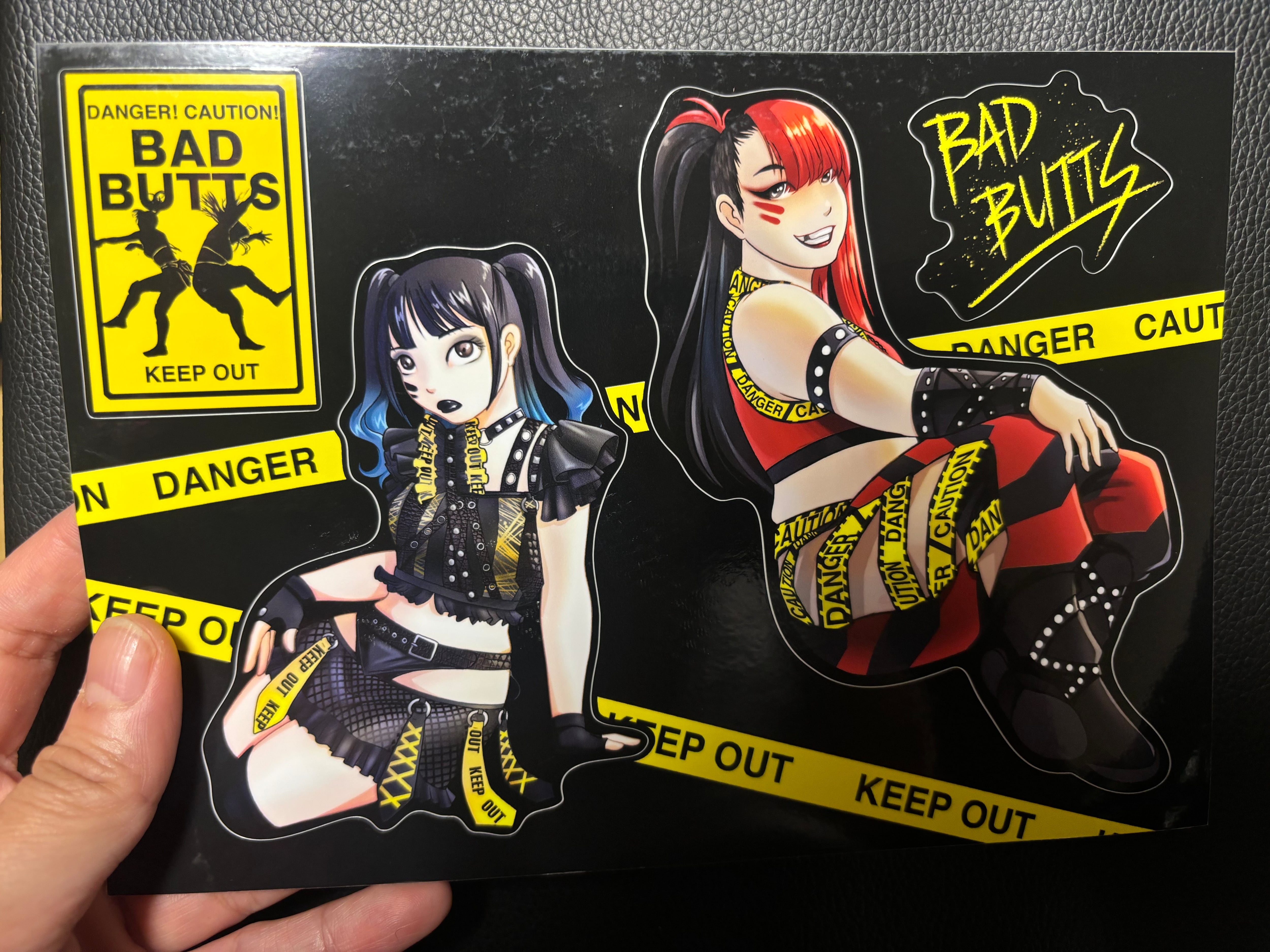 High quality large sized stickers that are peelable and restickable! Turn your everyday items into Bad Butts items! Featuring art by Yappy!